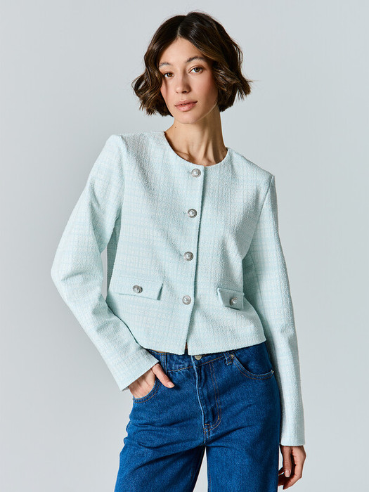 Этот укороченный женский жакет прямого силуэта станет стильным дополнением вашего гардероба. Горловина круглой формы и длинные рукава придают жакету элегантный вид. Застежка на петли и пуговицы обеспечивает удобство, а спереди располагаются клапаны с пуговицами, добавляя изделию изысканности. Для его выполнения использовали материал академик с добавлением люрекса, который придает характерный легкий блеск. Этот жакет идеально подойдет для создания стильных образов, добавляя в ваш наряд нотку изящества и шика.