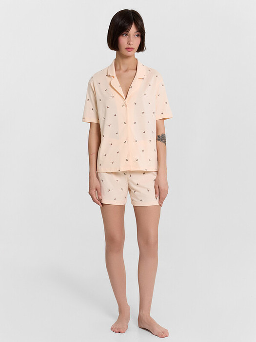 Комплект женский состоит из рубашки и шорт. Рубашка свободного силуэта, с отложным воротником. Рукав втачной короткий, линия плеча немного спущена, рукав обработан вподгибку. Рубашка с центральной застежкой с петлями и пуговицами. Низ застрочен швом в подгибку.