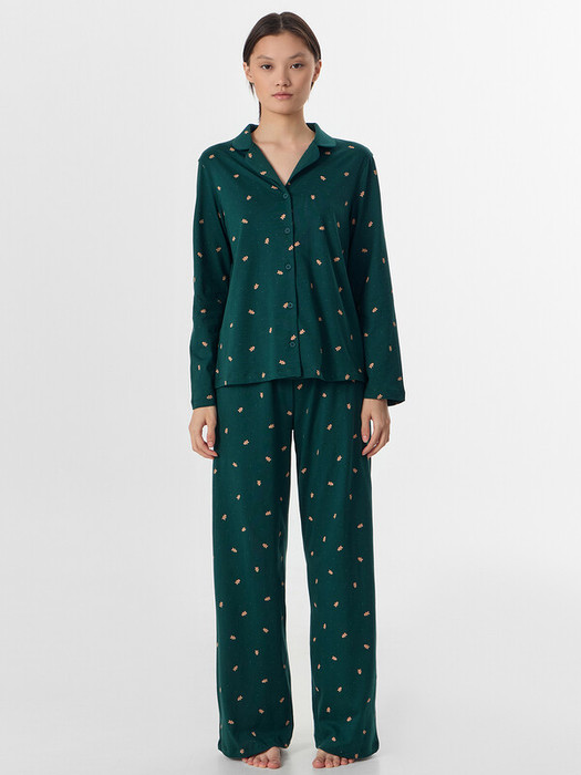 Бежевая пижама с зимним рисунком подарит вам ощущение тепла и уюта в холодные вечера. Этот очаровательный комплект состоит из удлиненного жакета и свободных брюк — идеальный выбор для спокойного сна и расслабленного отдыха.