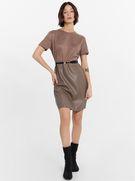 Платье женское выполнено из трикотажного полотна "под замшу) (лиф) и трикотажного полотна "под кожу" (юбка). Платье прямого силуэта, длиной мини. Горловина круглой формы обработана обтачкой из основного полотна. Рукав втачной, короткий. Нижний срез обработан швом вподгибку. Платье отрезное по линии талии. Нижняя часть платья выполнена из трикотажного полотна "под кожу". Нижний срез платья "сырой"
