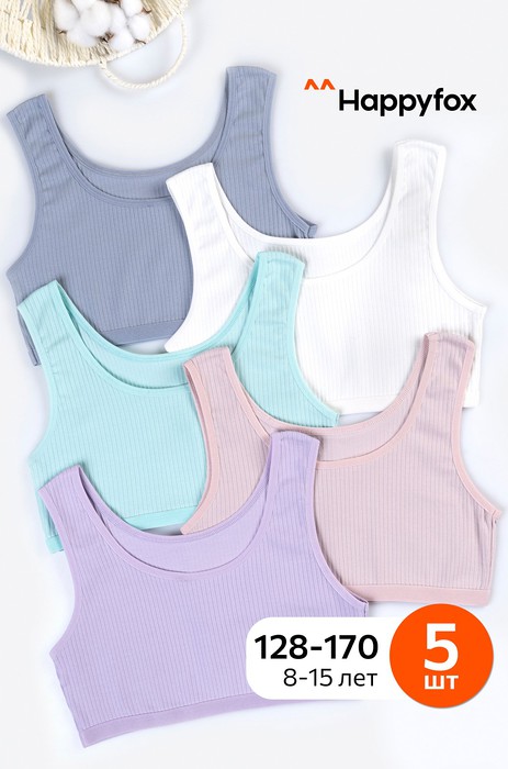 Набор детских топов в рубчик 5 штук для девочек и девочек-подростков выполнен из нежного хлопка. Благодаря фактурной ткани лапша топики на широких бретелях отлично тянутся и дарят свободу движений. Укороченные топы представлены в базовых пастельных цветах.
