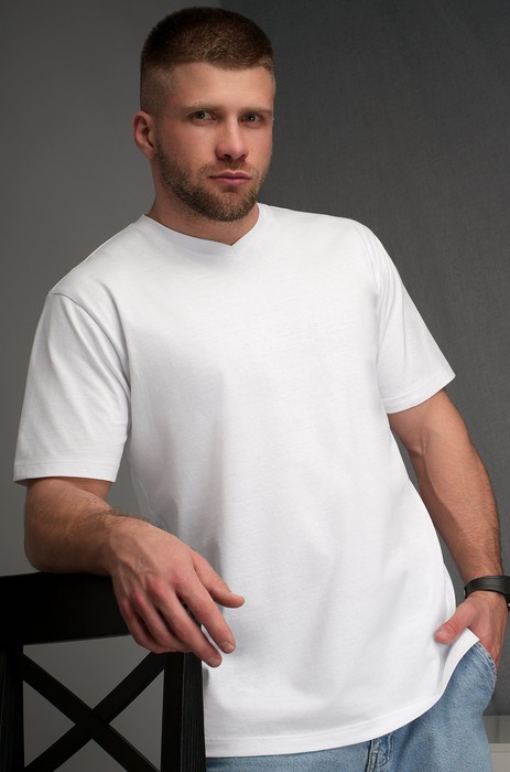 Мужская футболка не будет ограничивать движения и наполнит ощущением релакса. Простой прямой крой и v-вырез горловины подчеркивают классическую элегантность. Базовая футболка больших размеров – идеальный вариант для повседневных образов.