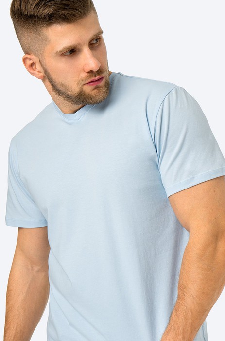 Стильная деталь стильного образа – футболка с V-вырезом. Мужская футболка сочетает в себе комфорт, лаконичность и уверенный характер. Прямой крой и голубой цвет делает её универсальным выбором для лета.