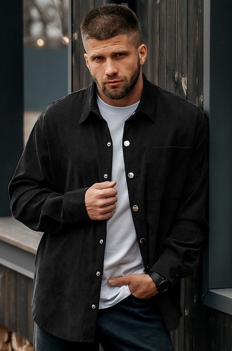 Мужская черная рубашка из мягкого вельвета – отличный способ подчеркнуть свою индивидуальность. Свободный крой подарит уют и комфорт, а карман на груди и застежка на металлические кнопки добавят стильную изюминку в образ. Однотонная вельветовая рубашка с удлиненной спинкой идеальна для прохладной весны и зябкой осени.