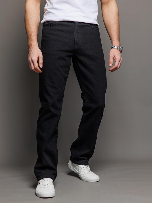 Мужские классические джинсы с пятью карманами. Посадка Regular fit (полуоблегающие по бедру), высокая талия. Застежка на молнии. Немного заужены в колене и по низу. Выполнены из традиционной хлопковой ткани denim, цвет ткани Black/Black (лицевая и изнаночная стороны ткани черные). Специальная темная стирка без потёртостей.