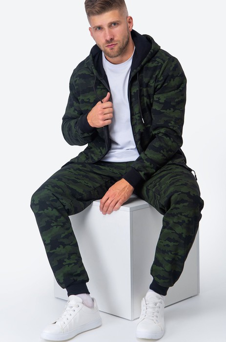 Мужской спортивный костюм выполнен из 100% хлопка, плотного футера трехнитки. Демисезонный камуфляжный костюм состоит из толстовки с капюшоном и брюк джоггеров. Мастерка с застежкой на молнию и карманами, капюшон регулируется по объему. Штаны дополнены карманами, пояс утягивается шнуром, по низу расположены эластичные манжеты.