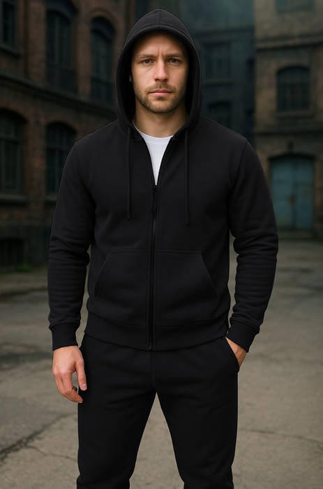 Спортивный мужской костюм выполнен из плотного футера трехнитки. Худи с застежкой на молнию, глубокий капюшон и мягкие манжеты делают черный костюм для мужчин невероятно уютным и практичным.