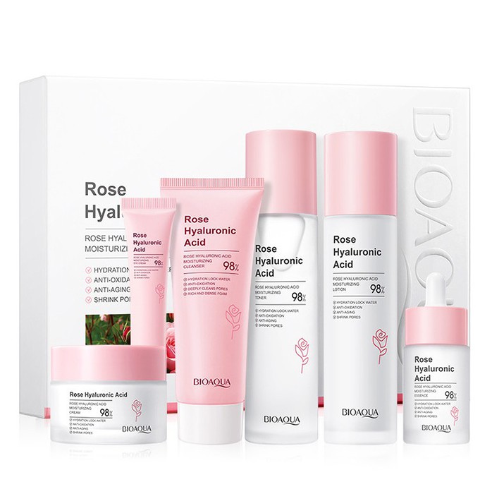 Подарочный набор для лица с розойи гиалуроновой кислотой BIOAQUA - это полноценный комплексный набор для ухода за кожей лица. Увлажняет кожу, борется с сухостью, возвращает ей нежность и упругость. Кожа приобретает здоровый, сияющий вид.Набор подходит коже всех типов, особенно для сухой и чувствительной., В набор входит:1. Пенка для умывания, 100 гр. Очищает и увлажняет кожу. Выдавите на ладонь небольшое количество пенки из тюбика, добавьте воды, чтобы средство слегка вспенилось. Смочите лицо водой, нанесите пенку на влажную кожу, растирайте массирующими движениями 1-2 минуты. Умойтесь тёплой водой.2. Увлажняющий тонер, 100 мл. Препятствует потере влаги. Нанесите тоник на сухое очищенное лицо при помощи ватного диска. Используйте утром и вечером. Избегайте область вокруг глаз.3. Увлажняющее молочко (лосьон), 100 мл.Делает кожу сияющей. На очищенное лицо нанесите несколько капель на лицо, мягко помассируйте до полного впитывания.4. Крем вокруг глаз, 20 гр.Борется с сухостью кожи вокруг глаз, возвращает ей упругость. Нанести небольшое количество крема на область вокруг глаз и распределить подушечками пальцев до полного впитывания.5. Сыворотка, 30 мл. Увлажняет кожу, восстанавливает упругость и молодость. На очищенное лицо нанести 2-3 капли сыворотки и массажными движениями вбить ее в кожу. Подождите несколько минут и дайте время впитаться. Использовать рекомендуется перед сном ежедневно. При регулярном применении сыворотки можно достичь наибольшего эффекта.6. Крем против морщин, 50 гр.Нанести небольшое количество крема на лицо и распределить подушечками пальцев до полного впитывания.