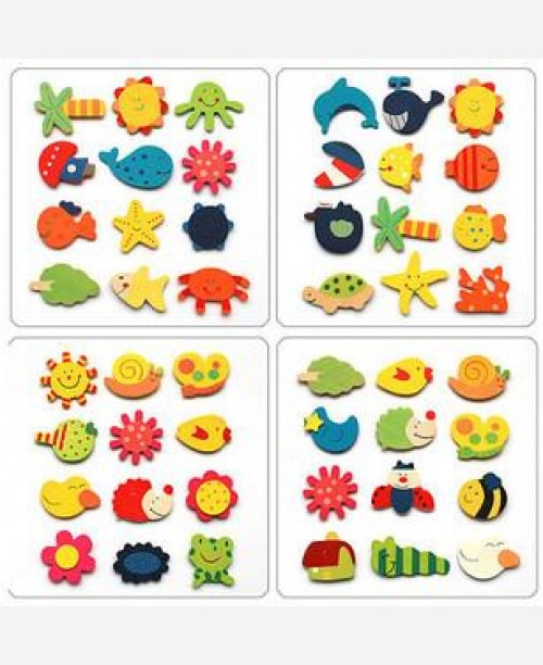 Материал: дерево. Размер магнита: около 4 см. В наборе 12 разных магнитов в ассортименте.