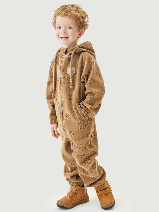 Комбинезон СМАЙЛ из вельвета, дублированного велюром. Вельвет - это мягкая, бархатистая ткань в рубчик. Благодаря тому, что с изнаночной стороны вельвет продублирован мягким велюром, ребенку будет комфортно и тепло в прохладные дни.Функционал: - длинная центральная застежка обеспечивает легкое одевание малыша, - карманы на молнии, - кулиса для регулировки объема по капюшону, - резинка на спинке для создания силуэта.  Мы все продумали до мелочей, поэтому модель дополнительно оснащена эластичными резинками по низу рукавов и брючин.    Комфортная температура эксплуатации от +10°С до +20°С. Рекомендуем приобрести комплектом аксессуары, обувь и другие вещи из капсулы в карточке товара, которые отлично сочетаются с изделиями коллекции