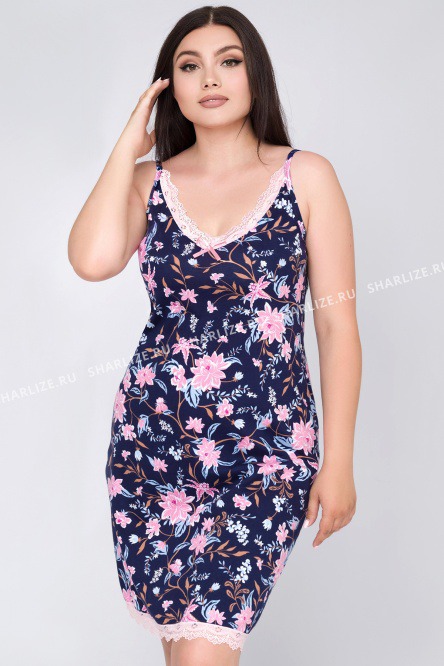 Женственная ночная сорочка из мягкого трикотажного полотна с изысканным набивным рисунком.Модель на тонких бретелях.Силуэт сорочки имеет прилегание на груди и завышенную талии.Линия декольте и низ сорочки украшен розовым кружевом.