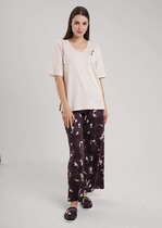 Сорочка женская из трикотажного полотна «кулирка» слегка расширенная книзу, без рукавов. Кружевные детали кокетки на полочке образуют V-ный вырез горловины. На нижней части полочки по шву притачивания кружевной кокетки заложены симметричные складки, проймы окантованы основным материалом.