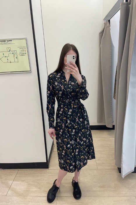 Платье свободного силуэта, расширенное книзу из вискозной плательной ткани. Низ изделия асимметричной длины (спинка чуть удлинена относительно переда). V-образный вырез горловины с декоративной завязкой. Втачной рукав со сборкой по окату и низу рукава. Асимметричный низ рукава и вырез горловины окантованы косыми бейками. В комплекте пояс из основной ткани.