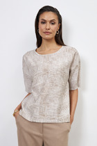 Блуза свободного силуэта из блузочной ткани. Втачной рукав на высокой манжете с застёжкой на пуговицы. Круглый вырез горловины обработан косой бейкой. По среднему шву спинки застёжка на петлю-пуговицу.