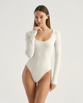 Женский облегающий боди. Втачной длинный рукав. Вырез круглый. Застежка в паховой части на крючки.