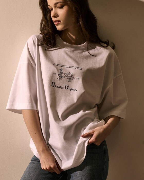 Футболка свободного силуэта. Спущенное плечо. Горловина из двух деталей, из рибаны.