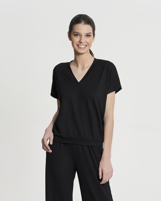 Футболка V-neck с цельнокроенным рукавом. Притачной пояс по низу футболки из основной ткани.