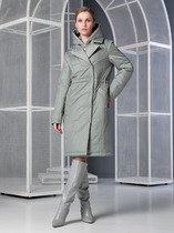 Пальто женское, прямого силуэта со смещенной застежкой на молнию (внутренняя) и кнопки. Линия плеча спущенная, рукав втачной одношовный. По переду карманы с личточкой. По спинке средний шов. Капюшон с центральной частью и отделочной деталью по отлету. В качестве отделки используется фурнитура и детали. Утеплитель- синтепон 150 гр.