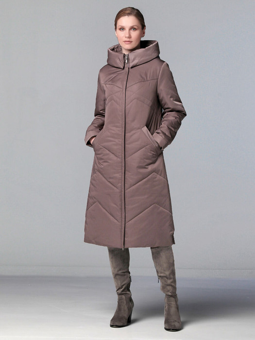 Элегантное демисезонное пальто средней длины полуприлегающего силуэта с легким А-образным расклешением, с застежкой на двухзамковую молнию, которую можно расстегнуть как сверху, так и снизу. Модель такого пальто подходит для девушек и женщин разной возрастной категории. Декоративные строчки красиво подчеркивают и "вытягивают" силуэт. Длина втачного рукава регулируется отворотом. Воротник - уютная стойка, переходящая в капюшон. Удобно расположенные карманы застегиваются на молнию. Есть внутренний кармашек, тоже на молнии. Плащевая ткань, из которой выполнено изделие, имеет водоотталкивающую пропитку, выдерживающую небольшой  дождь, снег и ветер. Хорошо зарекомендовавший себя утеплитель " Холлофайбер", плотностью 200гр/м, защитит от холода. Подкладка в изделии выполнена из ткани в мелкую полоску.