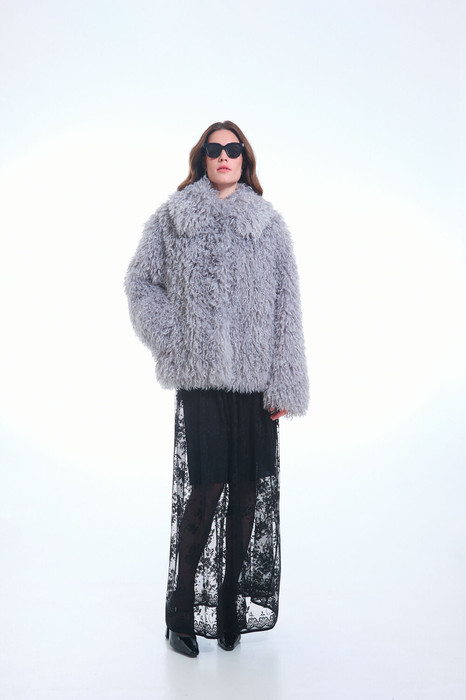 Пальто женское демисезонное из искусственного меха, однобортное, прямого силуэта, длиной до середины бедра, на подкладке. Застежка на 4 пришивные кнопки. Перед с функциональными карманами «щель». Рукав длинный, одношовный. Воротник и лацкана отложные.