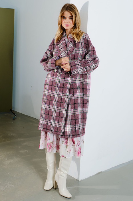 Пальто свободного кроя в стиле оверсайз, на подкладке. Воротник пиджачного типа с отложным воротником и лацканом, застёжка двубортная на петли и пуговицы, в боковых швах прорезные карманы. По спинке средний шов, переходящий в отлетную шлицу. Пальто выполнено из нежнейшего, хорошо драпирующегося полотна с содержанием шерсти, которое не сковывает движения, и в нём чувствуешь себя максимально комфортно.