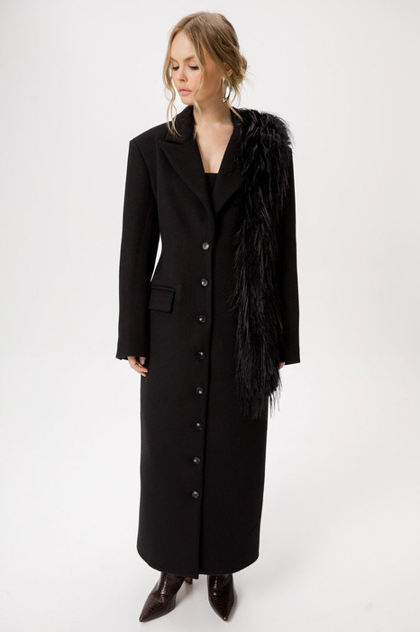 Детали: приталенный силуэт, свободный крой с расширенными плечами, перед с прорезными карманами, талиевые вытачки, воротник пиджачного типа, застёжка центральная на петли и пуговицы, втачные длинные рукава, пальто на подкладке.