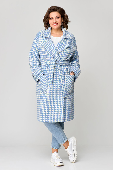 Пальто женское двубортное прямого силуэта, длиной  чуть ниже колена.  Воротник отложной с лацканами. По переду накладные карманы.  Линия плеча спущена. Рукав втачной, по низу пата с пуговицей. Застежка на две петли и пуговицы и потайную пуговицу. На правой половине переда расположены две отделочные пуговицы симметрично петлям. Спинка со средним швом по низу шлица. Изделие на подкладке.