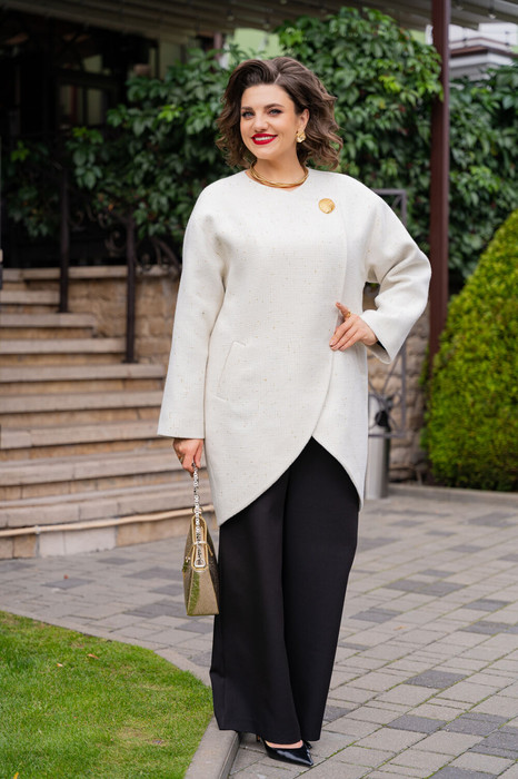 Пальто свободного покроя с лёгким заужением к низу и со спущенной линией плеча. Подкладка с синтепоном, что придает дополнительный комфорт в прохладную погоду. Спинка со средним швом. По переду имеются прорезные карманы с листочкой. Борта закруглённой формы. Застежка двубортная на пришивные кнопки. Верхняя пуговица авторской формы.
