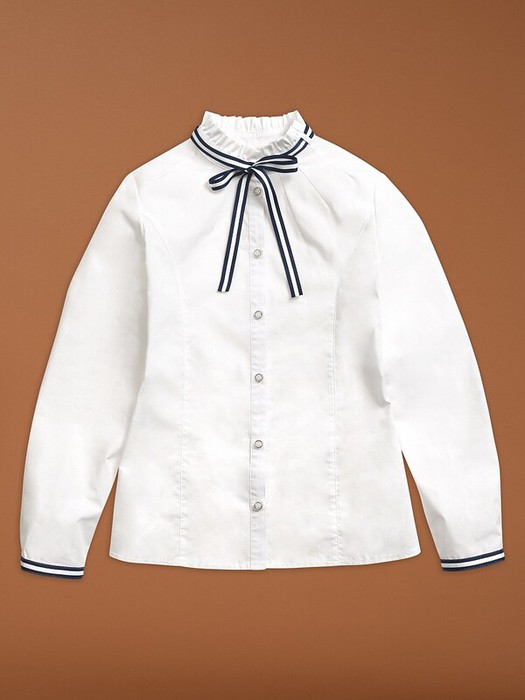 Классика, которая запомнится. Белая рубашка полуприлегающего силуэта имеет яркие акцентные вставки в виде тесьмы на манжетах и съемного декоративного банта под горловиной. Необычное прочтение воротника-стойки с аккуратно-заложенными рюшами удачно дополнено оригинальными лучами-вытачками. Актуальный образ можно сочетать с любым элементом костюма. Изделие подчеркнет характер молодой модницы и избавит мам от головной боли за школьный гардероб.