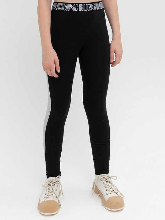 Трикотажные лосины для девочек со средней посадкой. Леггинсы сшиты из ткани с высоким содержанием хлопка, которая приятна на ощупь и комфортна в ношении. Благодаря добавлению эластана леггинсы идеально облегают ноги, хорошо тянутся и не сковывают движение. Вставки из ткани контрастного цвета делают ноги еще стройнее. Пояс из широкого тканого эластика с текстом "танцуй, прыгай, бегай" не сдавливает живот, не закатывается и не врезается. Идеальны для занятий спортом в комбинации с кроп-топом, на улицу и для дома с удлиненными футболками и худи.