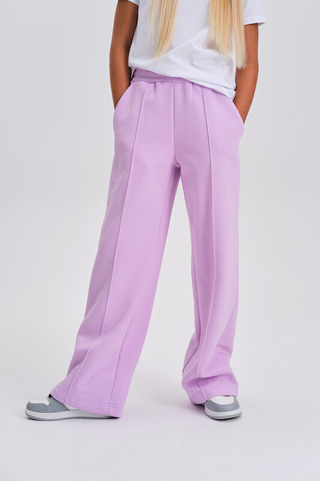 Брюки палаццо для девочки. Актуальные брюки свободного кроя подарят ребёнку комфорт и не будут стеснять движений. Широкая резинка в поясе не давит и не перекручивается. С помощью внутреннего шнура в поясе можно регулировать объём и посадку брюк. По переду застроченные стрелки — модный тренд сезона. По бокам глубокие наклонные карманы. Изделие лаконичного дизайна, без принта. Брюки неприхотливы в уходе. В составе ткани (футер с начёсом) преобладает качественный хлопок — штаны тёплые, мягкие и воздухопроницаемые, дают коже дышать. Благодаря полиэстеру изделие легко стирается, быстро сохнет и сохраняет первоначальную форму в течение долгого времени. Брюки детские выполнены в нескольких универсальных и трендовых цветах — они легко комбинируются с различными футболками, джемперами, толстовками, куртками. Палаццо брюки для девочек дошкольного и младшего школьного возраста, а также девочек-подростков. Брюки широкого кроя подходят для детского сада, прогулок, активного отдыха, спорта, а также для дома. Помните о правильном уходе за изделием: рекомендуется стирать при температуре не выше 30 °C, без предварительного замачивания, с изнанки. Это поможет сохранить качество и цвет брюк на длительное время.