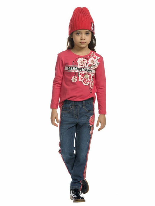 Джинсы для девочек. Джинсы Slim-силуэта из плотного, тонкого, эластичного хлопка. Полукруглые боковые карманы впереди и накладные карманы на спинке, металлическая фурнитура. Пояс на резине с внутренней регулировкой шнуром. Лампасы из декоративной тесьмы. Эластичный принт.
