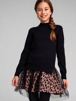 Джемпер с длинным рукавом из мягкого хлопкового трикотажа с небольшим содержанием эластана, полуприлегающего силуэта, с отложным круглым воротником на цельнокроеной стойке. По центру переда планка с декоративными пуговицами, вдоль которой застрочены вертикальные складки и кружево с фестонным краем. Рукава выполнены из кружевного эластичного полотна. По спинке застежка на две пуговицы.