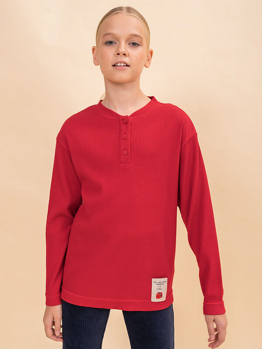 Джемпер-хенли для девочки в ярко красном цвете с первого взгляда привлекает уютным кроем и стильными деталями.