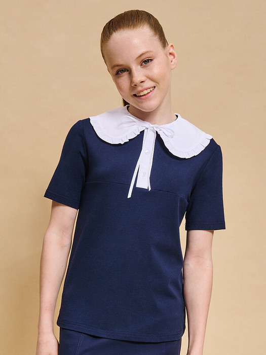 Трикотажная блузка для девочек умеренного объёма, выполнена из эластичного хлопкового материала с коротким рукавом. Новым элементом в блузке является большой плосколежащий воротник фигурной формы, декорированный рюшей по внешнему краю, выполненный из отделочной швейной ткани. Удобство надевания изделия через голову обеспечивается спроектированной спереди планкой из швейного полотна с застежкой на пуговицы. Нижний край планки вшит в кокетку переда.  Сзади под воротником пришита узкая декоративная репсовая тесьма, которая завязывается спереди на бантик под воротником.