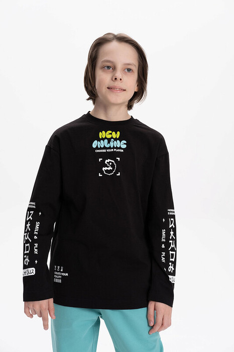 Лонгслив для мальчика. Джемпер свободного силуэта со спущенным плечом. Футболка с длинным рукавом выполнена в стиле Digital.  Горловина обработана эластичной рибаной - голова не застрянет. Водолазка без горловины украшена молодежным ретро-принтом Pac-man (пакмен), который немпременно оценят юные геймеры. Кроме принта по переду изделия есть надписи, перевод надписей: "new online" - новый онлайн, "choose your player" - выбери своего игрока, "create your reality" - создавай свою реальность. Рукава также украшены принтом-надписью в японском стиле, он эластичный и прочный, без проблем переносит частые стирки. Перевод надписей на рукавах: "камон, normal is boring" - камон, нормальное это скучно, "smile and play" - улыбайся и играй. Тонкая кофта в стиле аниме подойдет для малышей и подростков. Прекрасный выбор для детского сада, спортивных тренировок, для отдыха дома. Изделие можно носить весной, летом, осень и зимой.