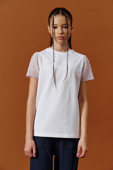 Школьная трикотажная блузка для девочки с кружевом и короткими рукавами — стильная, удобная и практичная модель, идеально подходящая как для повседневных школьных будней, так и для торжественных мероприятий. Изделие выполнено из мягкого трикотажа, приятного к телу, с аккуратной посадкой по фигуре — блузка небольшого объема комфортна даже при длительной носке. Округлая горловина обработана эластичным притачным пайпингом, который хорошо держит форму и не натирает. Спереди кокетка из широкого кружева, придающее образу нарядность и изысканность. Короткие рукава из одного слоя кружева выглядят воздушно и легко, а небольшая сборочка поверху создаёт нежный и женственный силуэт. Блузка прекрасно сочетается с юбками, брюками, сарафанами, делая её универсальным вариантом для школьной формы. Она проста в уходе, хорошо переносит стирки и долго сохраняет презентабельный вид.