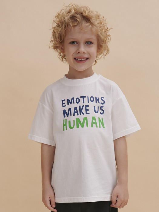 Модель представлена в белом цвете. Белая футболка для мальчика - оптимальный вариант на любой выход. Футболка для мальчика с принтом спереди украшена надписью "Emotions make us human" – перевод "Эмоции делают нас людьми". Изделие привлекает интересным дизайном - принтом сзади. Свободная футболка для мальчика подростковая рассчитана на возраст садика и школы. Размерная линейка: 1 (86); 2 (92); 3 (98); 4 (104); 5 (110); 6 (116); 7 (122); 8 (128); 9 (134); 10 (140); 11 (146).