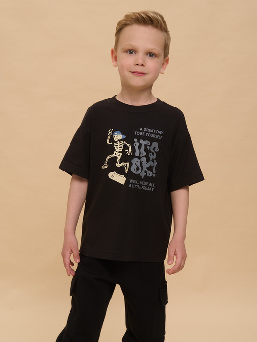 Детская футболка для мальчика. Комфортная майка умеренного оверсайз-объёма со спущенным плечом подарит ребёнку свободу движений. Вырез горловины обработан эластичной рибаной (ткань в рубчик) — она отлично держит форму, не растягивается, при этом ребёнку удобно надевать и снимать футболку. Изделие неприхотливо в уходе. Футболка детская с принтом в актуальном готическом стиле. Надписи переводятся: «хороший день, чтобы быть собой», «всё окей!», «все мы немного странные». Принт эластичный и устойчивый, хорошо переносит многочисленные стирки. Фишка модели — принт светится в темноте! Это не оставит равнодушным ни одного ребёнка! В составе ткани 100% хлопка — майка мягкая, воздухопроницаемая, приятная на ощупь. Футболка для мальчиков выполнена в универсальной расцветке, её легко сочетать с различными брюками, джинсами. Детские футболки с принтом подходят как для маленьких мальчиков, так и для подростков. Оверсайз-футболка для мальчика подходит для любого времени года, её можно носить как летом, так и в холодное время года в качестве среднего слоя одежды. Помните о правильном уходе за изделием: рекомендуется стирать при температуре не выше 30 °C, без предварительного замачивания, с изнанки. Это поможет сохранить качество и цвет футболки на длительное время.
