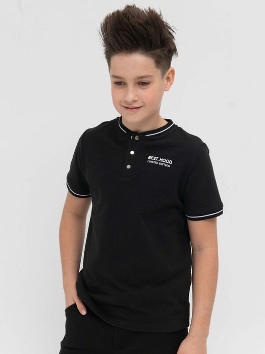 Черная футболка-хенли из ткани пике прямого кроя для мальчика. 100% хлопок в составе – ткань плотная, мягкая, дышащая, приятная на ощупь и простая в уходе. Воротник и рукава из рибаны с контрастной полоской вместе с лаконичным текстовым принтом придают футболке спортивный вид. Воротник застегивается на кнопки – удобно, практично, надежно. Футболка подходит для создания спортивного стиля, а также для школьных будней – отлично сочетается с пиджаком и брюками.