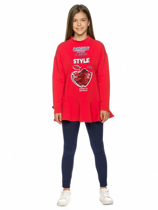 Костюм для девочек из футера: туника и лосины. Новинка кроя! Туника более свободного силуэта со спущенным плечом, рукава, слегка зауженные книзу, по низу изделия разноуровневый волан, поднимающийся вверх по правому боковому шву, аппликация в виде яблока из двусторонних пайеток, надпись с глиттером и золотистым блеском, перевод Мода выбирает сиять со стилем. Одевайся так, чтобы произвести впечатление. Утеплённые лосины из футера увеличенной формы для удобства надевания.