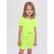 Комплект для девочек футболка и шорты из 100% хлопка. Футболка умеренного объема с мягкой линией плеча. Имитация многослойности - одна футболка, надетая поверх другой. Верхняя полосатая, с ассиметрично срезанным боковым швом и горловиной из рибаны в цвет нижней. Нижняя желтая. Принт с замаскированными в полоски мордочками кота. По центру вышивка из переворачивающихся пайеток и неоновый принт с глиттером, перевод Гламурная дива. Футболка с актуальными трендами сезона для самых продвинутых девчонок. Шорты умеренного объёма с защипами у пояса. Регулировка объема внутренним шнуром. Комплект можно носить по отдельности и это делает его универсальным.