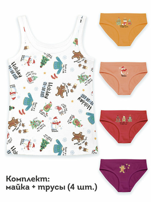 Детский комплект белья для девочки из хлопка с новогодним принтом. В набор входит бельевая майка на широких лямках и трусы слипы 4 штуки. Подарите ребенку праздничное настроение и хорошее начало дня. Новогодняя коллекция, яркий цветной набор с принтом с надписями, идеально подойдет для подарка ребенку. Пошив высокого качества, аккуратные швы, которые не доставят дискомфорт для ребенка. Трусики и майка идеально впишутся в гардероб девочки как базовое детское нижнее белье. Удобная и практичная модель майки для детей подходит для повседневной носки дома, как одежда для сна, для занятия спортом, для занятия спортом, а еще в нем весело готовиться и встречать новый год. Трикотажные детские трусики слипы для подростка с эластичной резинкой по талии надежно держатся на теле, не скручиваются, не закатываются и не сползают, а дышащая ткань позволяет избежать натирания нежной кожи.