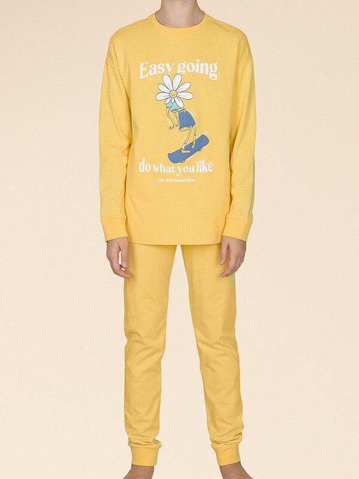 Стильная и уютная пижама актуального жёлтого цвета для девочки. В составе ткани 100% хлопка — идеально для детской одежды! Модель приятна на ощупь, прекрасно пропускает воздух, позволяя коже ребёнка дышать. При этом в пижаме из хлопка ребёнку будет тепло, даже если он сбросит одеяло. Всё это обеспечивает комфортный и качественный сон. Джемпер и брюки среднего объёма, плечо немного спущено, рукава широкие и свободные — в пижаме очень удобно спать. Широкая и мягкая резинка в поясе не перекручивается и не давит. Манжеты и отделка горловины из эластичной рибаны — она не растягивается, ребёнку удобно надевать и снимать пижаму. Брюки однотонные, жёлтого цвета. Джемпер украшает позитивный принт в виде ромашки на скейтборде. Надписи переводятся: "лёгкая на подъём", "делай то, что тебе нравится", "ты прекрасна". В линейке представлены детские пижамы следующих размеров: 2 (92); 3 (98); 4 (104); 5 (110); 6 (116); 7 (122); 8 (128); 9 (134); 10 (140); 11 (146). Хлопковый комплект идеален для сна как дома, так и в детском саду — прекрасный выбор для вашего ребёнка! Пижама с брюками подходит для круглогодичного использования. Домашний комплект — замечательный подарок дочке, внучке, сестре на любой праздник. Выбирайте нужный размер по таблице размеров на фото. Цвет товара на экране вашего устройства может отличаться от цвета изделия вживую.