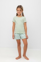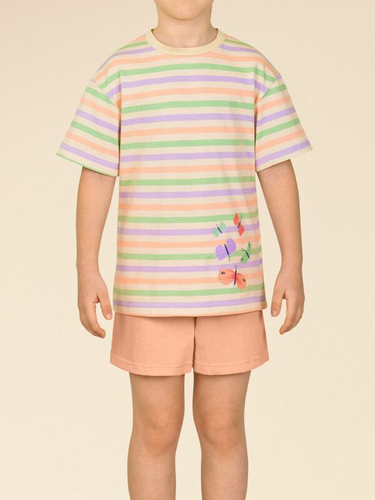 Стильная и уютная пижама в нежных пастельных оттенках для девочки. В составе ткани 100% хлопка — идеально для детской одежды! Модель приятна на ощупь, прекрасно пропускает воздух, позволяя коже ребёнка дышать. При этом в пижаме из хлопка ребёнку будет уютно, даже если он сбросит одеяло. Всё это обеспечивает комфортный и качественный сон. Свободная футболка и комфортные шорты, плечо немного спущено, рукава широкие — в пижаме очень удобно спать. Широкая и мягкая резинка в поясе не перекручивается и не давит. Отделка горловины из эластичной рибаны — она не растягивается, ребёнку удобно надевать и снимать пижаму. Шорты однотонные, персикового цвета. Футболку в полоску украшает милый принт в виде бабочек. В линейке представлены детские пижамы следующих размеров: 1 (86); 2 (92); 3 (98); 4 (104); 5 (110); 6 (116), 7 (122); 8 (128); 9 (134); 10 (140); 11 (146). Хлопковый комплект   идеален для сна и отдыха дома — прекрасный выбор для вашего ребёнка! Пижама с шортами для девочки подходит для круглогодичного использования. Домашний комплект — замечательный подарок дочке, внучке, сестре на любой праздник. Выбирайте нужный размер по таблице размеров на фото. Цвет товара на экране вашего устройства может отличаться от цвета изделия вживую.