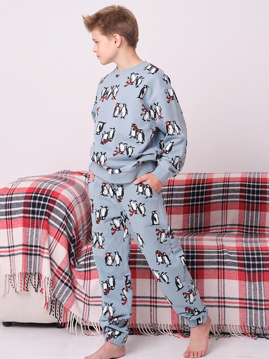 Костюм двойка для мальчика  состоит из свитшота и брюк умеренного объёма.  В поясе и по низу брюк мягкие и широкие резинки — не перекручиваются и не давят. Манжеты и отделка горловины из эластичной рибаны — они не растягиваются, джемпер удобно надевать и снимать.