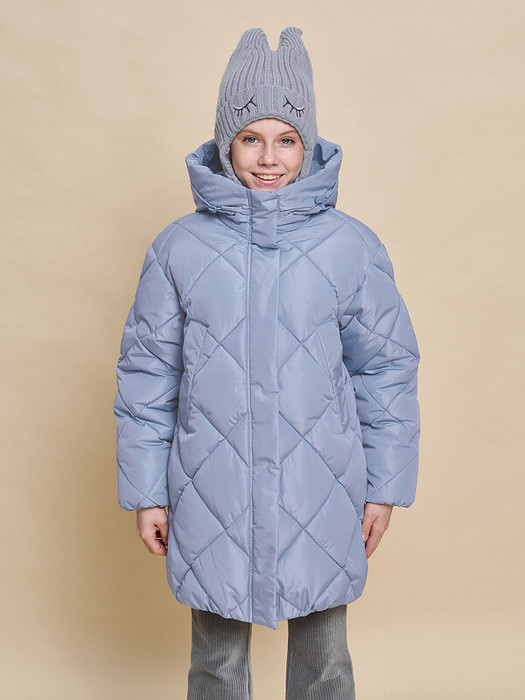 Куртка зимняя для девочки длиной до середины бедра. Модная пухлая куртка-зефирка украшена актуальной стёжкой в виде квадратных ромбов. На внешнюю поверхность материала нанесена водоотталкивающая пропитка (DWR), она задерживает грязь и влагу снаружи — ребёнок не промокнет от снега, а комбинезон легко отстирается. Также есть дополнительная пропитка на внутренней стороне ткани — для более надёжной защиты от промокания. Капюшон с двумя швами, что обеспечивает анатомически правильную форму и комфортную посадку по голове. По краю капюшона вставка, которая также придаёт милый эффект пухлости. Предусмотрена регулировка объема капюшона эластиком с пластиковыми стопперами. Подкладка капюшона и внутренний воротник из нежного и тактильно приятного бербер-флиса с фактурой «барашек». Центральная застёжка на  надежную пластиковую тракторную молнию. Куртка теплая — дополнительно, для защиты от ветра и холода, центральная молния закрыта ветрозащитной планкой на липучке (велькро). По низу рукавов внутренние манжеты из эластичной рибаны — они препятствуют задуванию ветра. Низ куртки и низ рукавов присобраны на широкую резинку с внутренней стороны, чтобы дополнительно придать изделию мягкий объём — пуховик напоминает лёгкое тёплое облачко.  Можно также дополнительно уменьшить объем по низу куртки с помощью эластичного шнура по стопперами. По бокам удобные прорезные карманы, закрываются на магниты — легко открывать и закрывать даже в варежках или перчатках. Справа внутри карман на молнии для важных мелочей. Карманы утеплены флисом. В каждой куртке есть нейм-лейбл! Ребенок не потеряется и не потеряет куртку! В боковых швах и на спинке расположены светоотражающие элементы — безопасность в тёмное время суток. Изделие неприхотливо в уходе. Модель без принта. Куртка с наполнителем из полиэстера — она тёплая, легко стирается, быстро сохнет, сохраняет отличную форму и цвет надолго. Подкладка из мягкого и тёплого флиса. Отличная куртка для девочки дошкольного и младшего школьного возраста, а также девочки-подростка. Идеальная, тёплая и красивая куртка на зиму. Рекомендуемый температурный режим: не ниже минус 30 градусов. Утеплитель: экопух. Зимний пуховик подходит для носки в детский сад, школу, для прогулок и активного зимнего отдыха, игр на свежем воздухе. Помните о правильном уходе за изделием: рекомендуется стирать при температуре не выше 30 °C, без предварительного замачивания, с изнанки. Это поможет сохранить качество и цвет куртки на длительное время.