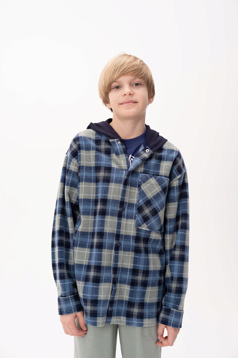 Рубашка флисовая для мальчика. Теплая толстовка в клетку идеальный вариант для весны. Застегивается на кнопки. Капюшон выполнен из футера, без регулировки объема. По переду накладной карман. Манжеты на рукавах застегиваются на кнопку. Размерная линейка подходит как для малыша так и для подростка.