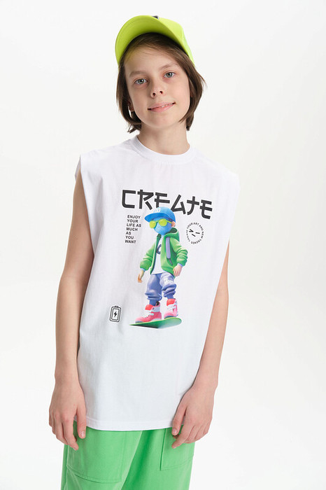 Летняя майка для мальчика свободного силуэта. Выполнена из 100% хлопка. Горловина из рибаны - голова не застрянет. По переду украшена ярким принтом с надписями. Перевод надписей: "create" - создавай, "enjoy your life as much as you want" - наслаждаяйся жизнью столько сколько ты хочешь, "create your art and new trends" - создавай свое искусство и новые тренды. Принты понравятся любителям японской и корейской культуры и стиля аниме.  Футболка без рукавов отлично подойдет для занятий спортом, походов на пляж и прогулок.