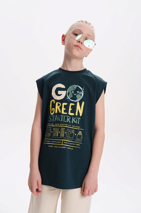 Летняя майка для мальчика свободного силуэта. Выполнена из 100% хлопка. Горловина из рибаны - голова не застрянет. По переду украшена принтом с надписями. Перевод надписей: "Go green! Started kit: your go green started kit includes: beeswax wrap, bamboo cultery, organic cotton mesh bags, organic cotton grocery bag" - Стань зеленым! Базовый набор: твой зеленый набор включает в себя: восковую упаковку, бамбуковые приборы и трубочки, сумки и упаковки из органического хлопка, "reusable .recyclable. 100% plastic free" - перерабатываются, многоразовые.100% без пластика, "make the planet smile" - подари планете улыбку.  Майка отлично подойдет для занятий спортом, походов на пляж и прогулок.